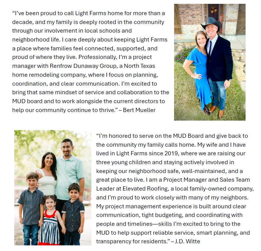 We are pleased to welcome Bert Mueller and J.D. Witte as Directors-elect to the MUD Board.