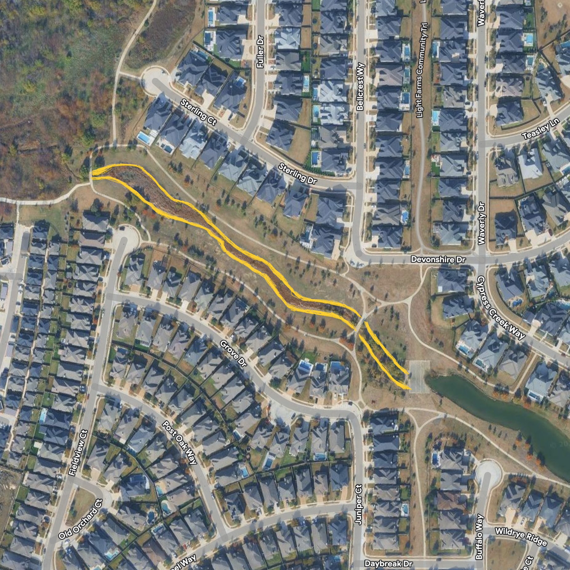 The MUD is partnering with Woodlake to clean and restore the creek corridor behind Grove Drive and Sterling Court (see highlighted area on the map).